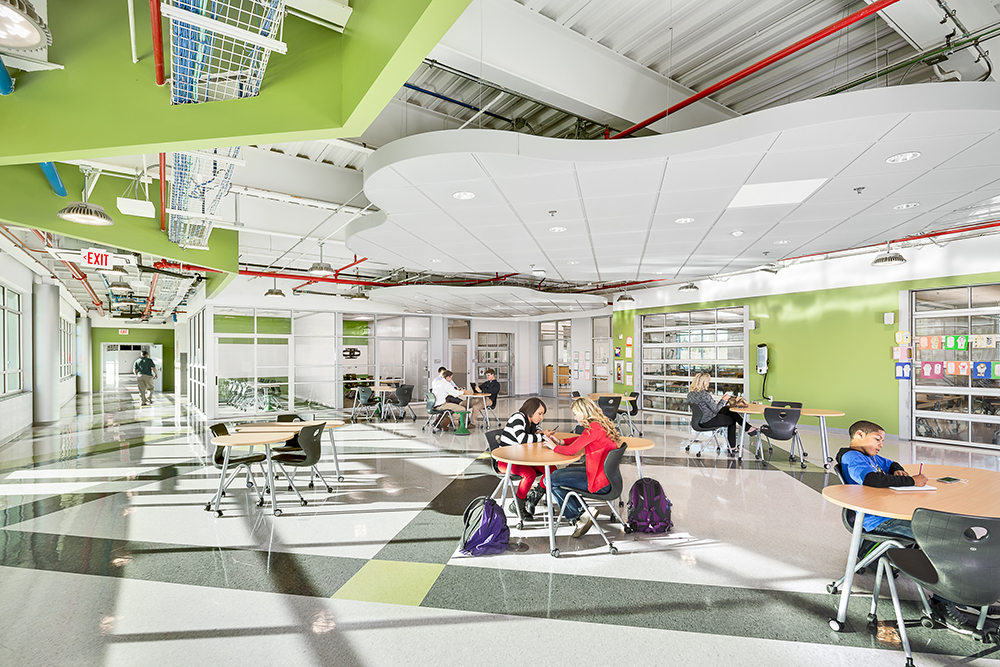 The interdisciplinary academic clusters housed in learning communities create connections between learning spaces so that teachers can plan and students can execute complex projects together. Each cluster has a gallery for finished student projects, and prototypes in process. Additionally, there are assembly spaces throughout the building for business, industry, and academic partners who include Clemson University, BMW and Goodyear.